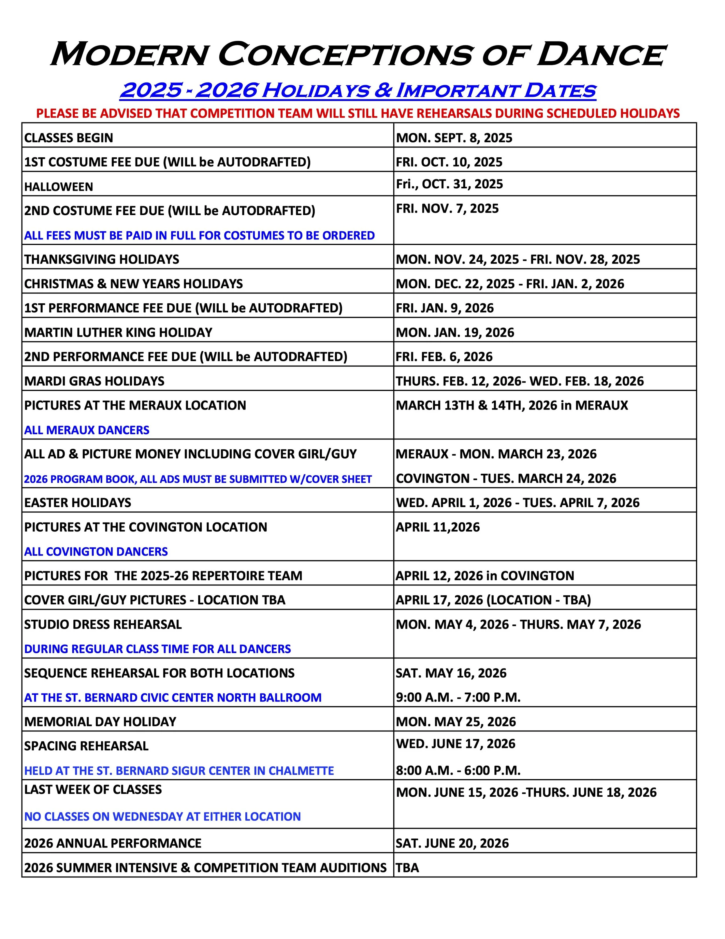 • Important Dates/Holidays